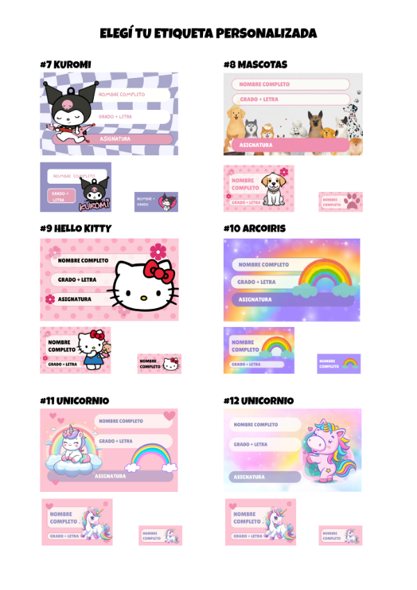 ✔ Etiquetas personalizadas con nombre, grado y personaje favorito.
